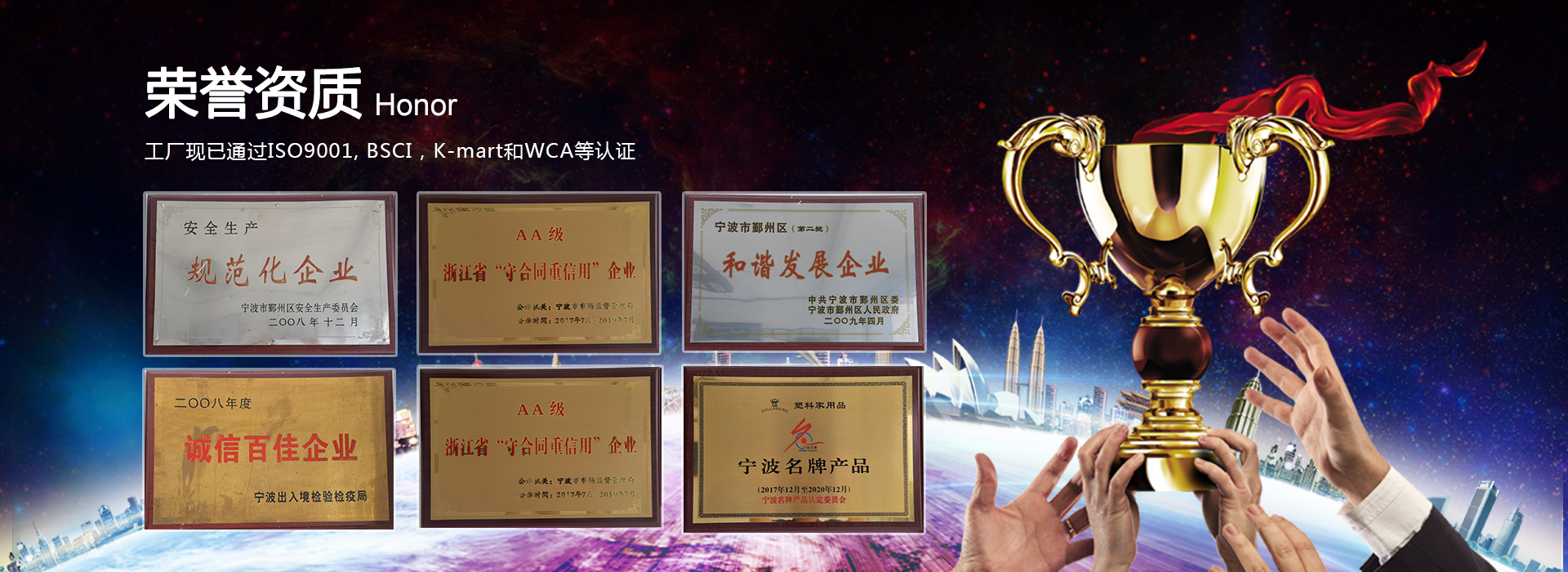 工廠現已通過ISO9001, BSCI,K-mart和WCA等認證。